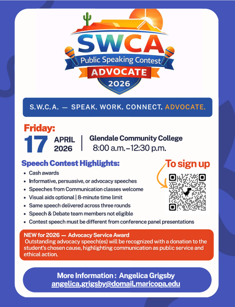 The Southwest Communication Association (SWCA) is a one-day state conference paired with a public speaking contest that brings together: